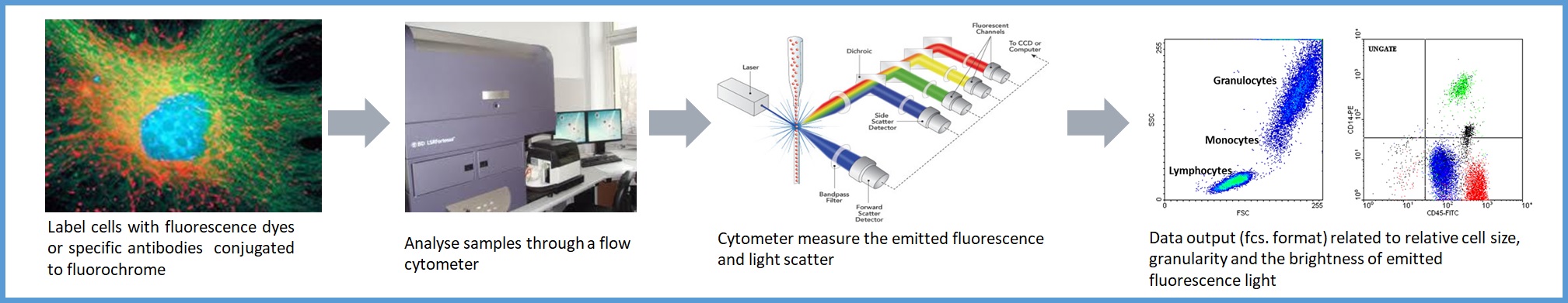 Flow Cytometry is a laser based technology that is used to measure the physical and chemical characteristics of cells. Such measurements are made while the cells flow in a liquid medium past an excitation light source and the emitted fluorescence captured by its measuring apparatus. It is an important tool for many scientific disciplines as it allows qualitative and quantitative examination of the whole cells as well as characterization of cells within a sample.