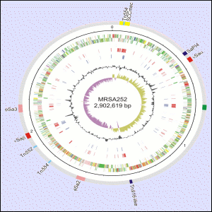 The genomes are 2,902,619 base-pairs (2675 genes – MRSA252) and 2,799,802 base-pairs (2566 genes – MSSA476). Although the core order of genes is conserved, comparisons show the genomes are peppered with regions of difference.