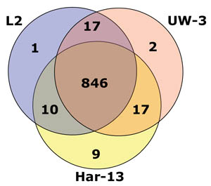 Distribution of predicted and functional coding sequences shared between C. trachomatis strains L2, UW-3 and Har-13.