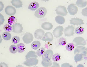 A thin blood smear stained with Giesma from a fatal human case of P. knowlesi malaria. (Credit: Dr Janet Cox-Singh, Malaria Research Centre, Faculty of Medicine and Health Sciences, University Malaysia Sarawak, Malaysia)