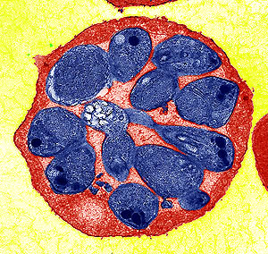 False-colour electron micrograph of a rhesus red blood cell infected with a mature segmented schizont-stage P. knowlesi malaria parasite, which is about to release its invasive merozoite stages. (Credit: Infected red blood cell: Anton Dluzewski, MRC NIMR and KCL, UK; Mary Galinski and Esmeralda VS Meyer, Emory Vaccine Center, Atlanta, USA; Lawrence Bannister, John Hopkins, Maryland, USA; Graham Mitchell, KCL and Guy’s Hospital, UK; John Barnwell, CDC, Atlanta, USA; Tony Holder, MRC NIMR, UK.)
