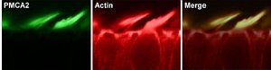 The PMCA2 pump, which is encoded by the Atp2b2 gene, is found in sensory hair cells of the auditory and balance parts of the inner ear. Here, the mutant pump is detected as green fluorescence and it is located in the sensory hairs or stereocilia at the top of each hair cell, a location that appears identical to that of the normal pump. However, the mutant pump shows defective calcium pumping activity.