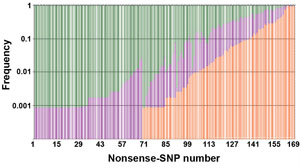 Frequency of nonsense-SNPs in the study sample, plotted on a log scale. Each vertical bar represents one SNP. Green, proportion of individuals with two copies of the normal allele; purple, proportion with one normal and one disrupting allele; orange, proportion with two copies of the disrupting allele. The plot shows that almost 60 per cent of SNPs could be found as homozygous truncated versions, resulting in gene inactivity.