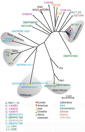 Saccharomyces phylogenomics. S. cerevisiae strains with clean lineages highlighted in grey; colour indicates source (name) and geographic origin (dots). Scale bar indicates frequency of base-pair differences.
