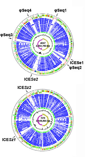 Schematic circular diagrams of the Streptococcus equi (top) and Streptococcus zooepidemicus genomes (bottom). Outer two circles are gene predictions: 11 concentric blue circles are matches with a series of species of streptococcus.