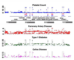 The team compared regions of the human genome implicated in blood cell development with regions associated with risk of heart disease. By looking at the genetic data of 10,000 people with disease with that of 10,000 apparently healthy people, they found that one of the genetic variants associated with platelet counts also causes an increased risk of heart disease. The new variant was found in a region of the genome already known to influence the risk of hypertension, coeliac disease and diabetes in children and young adults, or so-called type 1 diabetes.