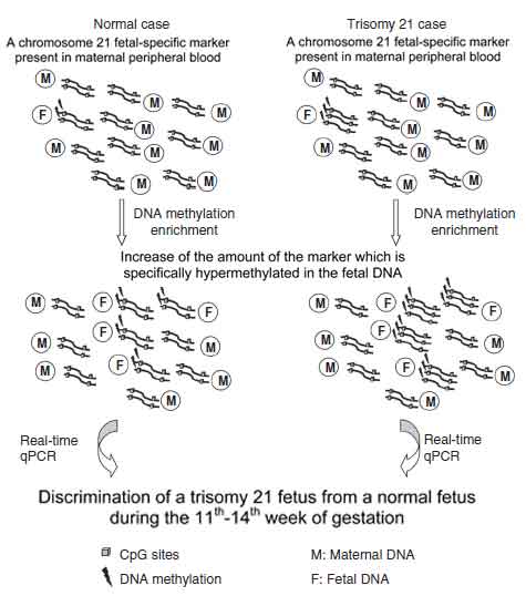 Schematic illustration of the approach towards the diagnosis of trisomy 21 cases with non-invasive prenatal diagnosis. The success of the diagnostic test relies on the identification of epigenetic markers on chromosome 21, which are hypermethylated in the fetal DNA and hypomethylated in the maternal DNA. The fetus with trisomy 21 has an extra copy of the fetal-specific methylated region compared to the normal fetus. DNA methylation enrichment will increase the amount of hypermethylated fetal DNA. Then real-time qPCR of a fetal-specific methylated region can lead to quantification of its copy numbers and therefore discrimination of trisomy 21 pregnancies from normal pregnancies.