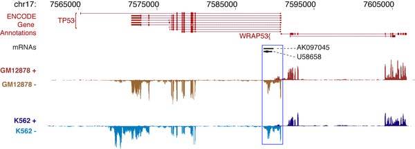 Selected ENCODE and other gene and transcript annotations in the region of the human TP53 gene on chromosome 17 GENCODE annotated isoforms of TP53 RNAs are shown in red at the top of the figure, along with annotation of the neighbouring WRAP53 gene. Below these are two mRNA transcripts, located in the first 10 kb intron of the p53 gene (U58658/AK097045, in black), from GenBank. The bottom two tracks show the structure of transcripts detected in nuclear polyadenylated RNAs from GM12878 and K562 cells, displayed according to the strand of origin (i.e. + and -). Signals are present at each of the detected p53 exons. Signals are also evident at the U58658 and AK097045 regions: such transcripts are reported to be induced during differentiation of myeloid leukaemia cells but are seen in both GM12878 and K562 cell lines. Finally the p53 isoform observed in K562 cells has a longer 3’UTR region than the isoform seen in the GM12878 cell line.