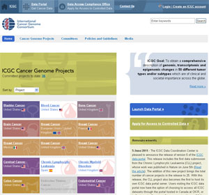 The National Cancer Centre/RIKEN in Japan has updated its whole genome data on 27 liver cancers, which includes the first whole genome sequence data of HCV-positive HCC (hepatitis C virus-positive hepatocelluar carcinoma) published in Nature Genetics on April 17. Researchers from Spain have provided complete genome sequences for patients with chronic lymphocytic leukaemia (CLL). The Spanish team described recurrent mutations in CLL in a publication in Nature on June 5. The Ontario Institute for Cancer Research in Canada has updated its data on pancreatic cancer. The ICGC data portal also includes information on breast, lung, and skin cancer provided by researchers from the Wellcome Trust Sanger Institute in the United Kingdom.