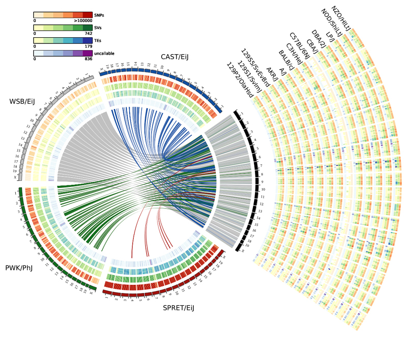 An overview of variants called from 17 mouse genomes relative to the reference. Four wild strains (CAST/EiJ, WSB/EiJ, PWK/PhJ and SPRET/EiJ) are shown in a circle with tracks indicating the relative density of single nucleotide polymophisms (SNPs), structural variants (SVs) and uncallable regions. Transposable element insertions (TEs), a subset of the SV calls, are shown as a separate track. Corresponding tracks are shown for each of the 13 classical laboratory strains to the right of the circle. Links crossing the circle indicate regions on the reference where the wild strain is closest to the reference.