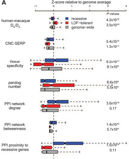 Distribution of recessive disease genes (blue) and LoF-tolerant genes (red) compared to all protein-coding genes (grey)