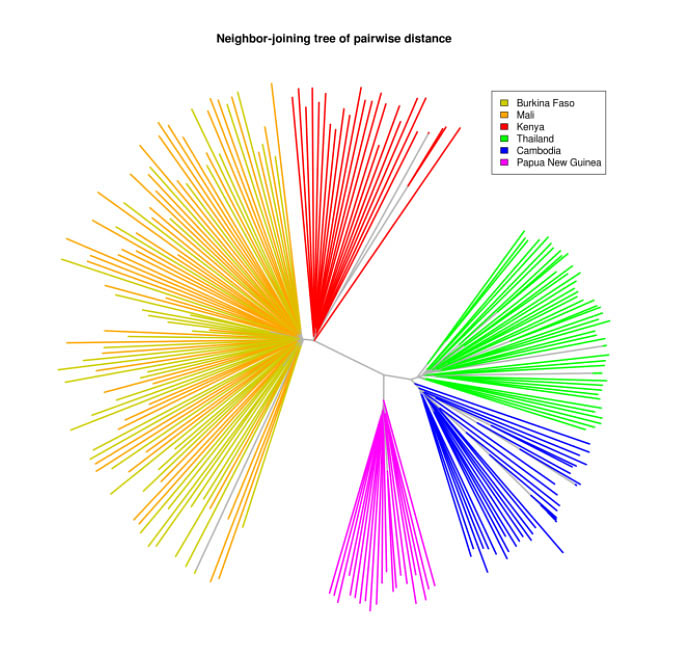 Samples taken from people in the neighbouring African countries of Burkina Faso and Mali, where there are very high levels of malaria transmission, showed strong intermingling of P. falciparum genomes.