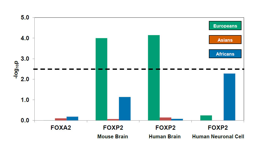 “Our method worked well and overall, there was strong evidence for selection of FOXP2-regulated genes in the Europeans, but not in the Asian, or African populations. The subset of FOXP2-regulated genes that were selected in Europeans play roles in neural cell development, cellular signalling, reproduction and immunity.”