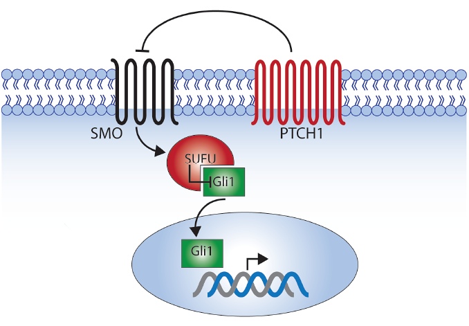 Hedgehog pathway with known cancer genes mutated in this series indicated.