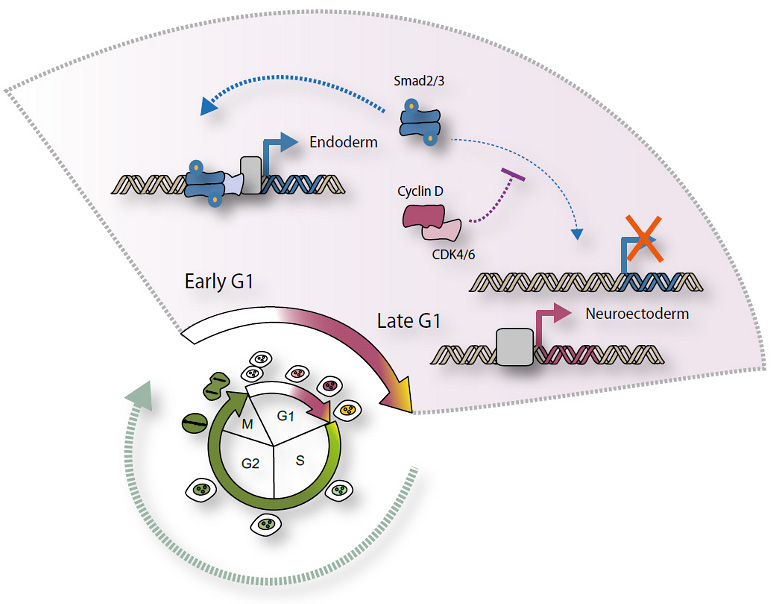Overview of the initiation of differentiation in hESCs. Early G1 phase directs cells into endoderm and mesoderm whereas neuroectoderm is blocked. Late G1 phase directs cells into neuroectoderm whereas endoderm and mesoderm is blocked.