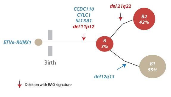 Phylogenetic tree showing the evolution of the leukaemia. This tree is derived from single cell analysis that shows that RAG mediated events occur at different time points through the patient’s lifetime and result in further clonal diversification of the leukaemia.