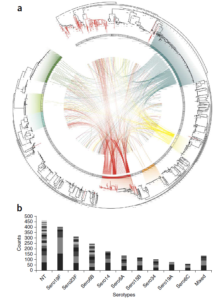 Population structure and genetic interactions of Streptococcus pneumoniae.(a) Family tree of a pneumococcal population with connections between recipients and potential donors of DNA fragments. (b) Most prevalent forms of the bacterium detected in the Maela population.