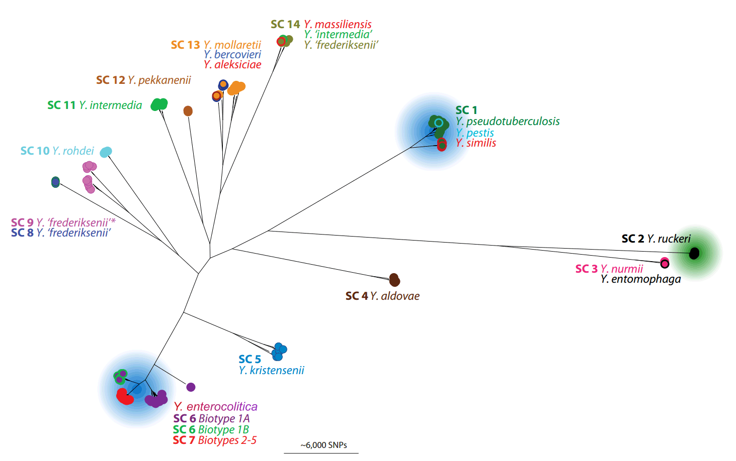 The family tree of Yersinia. Species and phylogenetic groupings are shown, with human pathogenic species highlighted in blue (Y. pestis, Y.pseudotuberculosis, Y. enterocolitica) and fish pathogenic species highlighted in green (Y. ruckeri).