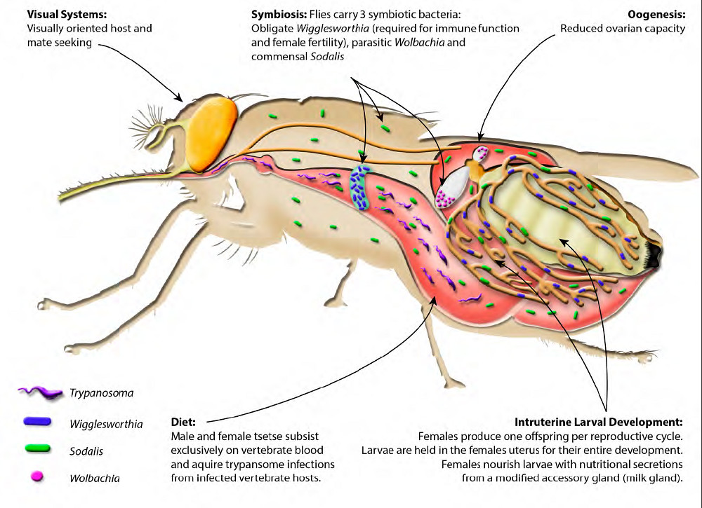 The tsetse fly is related to the fruit fly – a favoured subject of biologists for more than 100 years – but its genome is twice as large. Within the genome are genes responsible for its unusual biology. The reproductive biology of the tsetse fly is particularly unconventional: unlike most insects that lay eggs, it gives birth to live young that have developed to a large size by feeding on specialised glands in the mother.