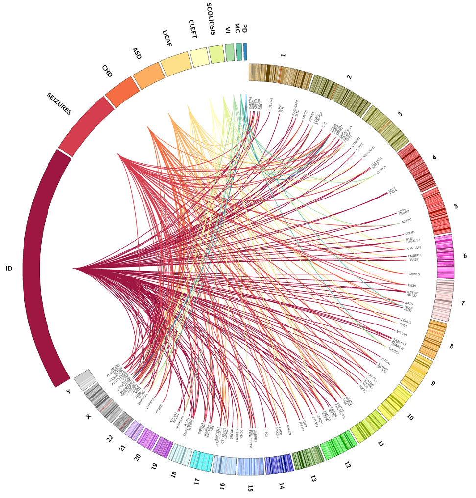 Individual genetic diagnoses associated with broad phenotype characteristics catalogued in known Developmental Disorders Genotype-to-Phenotype database genes. The circos-style plot links the genomic location of each gene with some key phenotypes in each child.