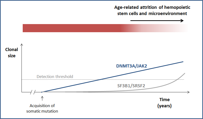 Some gene mutations only drive expansion of pre-leukaemic cells in advanced old age and in the context of an ageing haemopoietic system.
