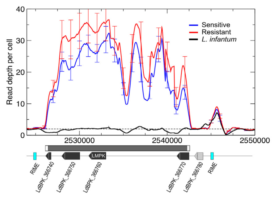 Copy number variation spanning MAPK locus on chromosome 36. Copy number per cell in L. donovani (red, resistant to SSG; blue, sensitive) was much higher for the MAPK locus than the chromosome 36 baseline for L. donovani (black dashed line) and L. infantum (black). The amplified region is marked in grey and their white edges indicate the location of two direct repeats. The MAPK (mitogen-activated protein kinase) gene is labelled as LMPK (LdBPK_366760). Two L. donovani ribosomal mobile elements (RIME) flank the duplicated region.