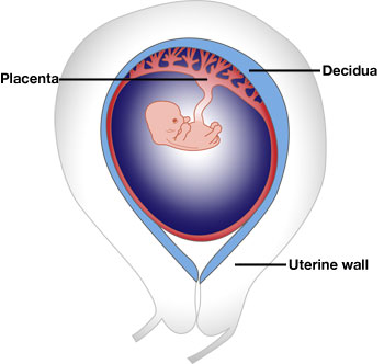 In pregnancy, the embryo is surrounded by a placenta that transports oxygen and nutrients from the mother. The placenta attaches to the lining of the uterus, known as the decidua. Placental cells – trophoblast cells – are fetal in origin and have its genetic make-up, which is different from the mother’s (maternal) cells. Trophoblast implant into the lining of the uterus to create the decidua, and invade to reach the specialised blood vessels in the wall of the uterus. This creates a vital blood supply for the placenta and the fetus.