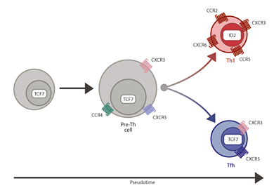 The researchers hypothesize that Cxcr5 and Cxcr3 are competing receptors that directly influenced Th1/Tfh cell fate. Credit: Science Immunology (2017) doi: 10.1126/sciimmunol.aal2192