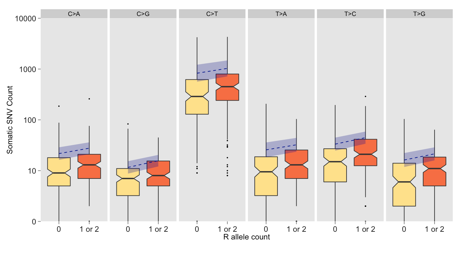 Distribution of single nucleotide variant (SNV) counts detected through exome sequencing of melanoma samples, grouped by the presence of R alleles of the MC1R locus shown as a boxplot with median, quartiles, whiskers and outliers.