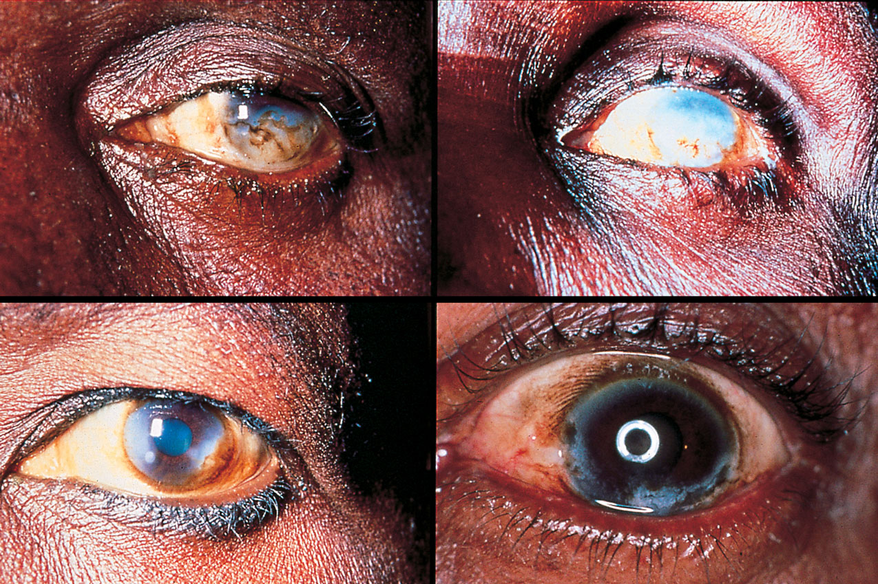 Various stages of sclerosing keratitis brought on by Onchocerca volvulus infection. Credit: Ian Murdoch & Allen Foster, Community Eye Health Journal Vol. 14 No. 38 2001