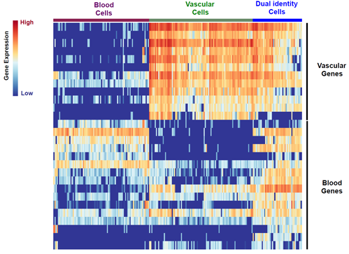 To understand the process of blood cell development the researchers studied seven factors – transcription factors – known to be important in blood cancers, using a powerful new technology called single cell transcriptomics. They discovered that in mouse embryo cells that were transitioning between vascular cells and blood cells, all seven of these factors were expressed together. However, when they engineered various combinations of these transcription factors into embryonic stem cell lines (ESCs), used to model embryonic blood development in the dish, they discovered the factors split unexpectedly into two distinct sets, one supporting the vascular cell fate and the other the blood program.