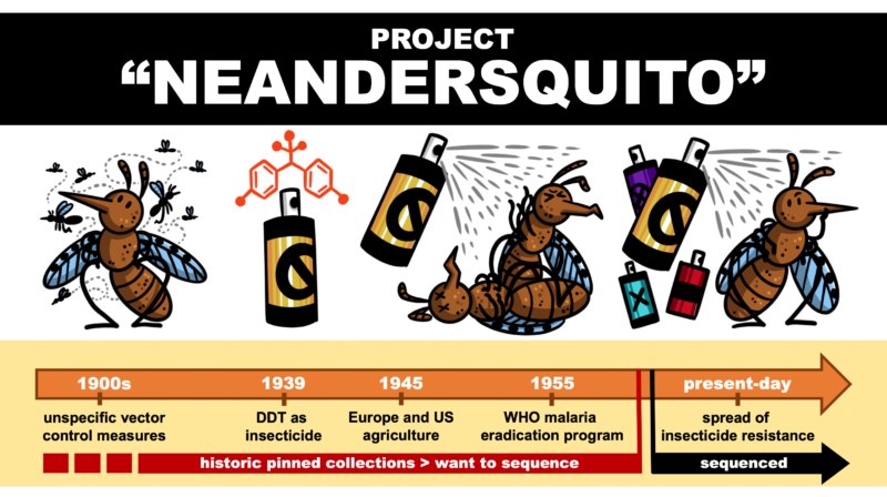 This is what we aim to research with Project Neandersquito, where we comb through historic museum and archival Anopheles collections, identify interesting samples that were collected before, during and right after the introduction of insecticides, and see if we can track the changes they caused in population genomic landscapes and insecticide resistance loci we see in individuals living today on a “real time” basis.