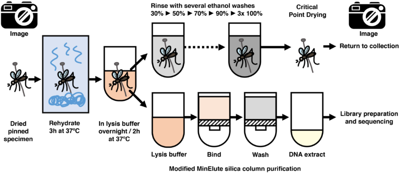 As these collections are limited and the specimens themselves are very fragile, we have worked hand in hand with museum curators and developed methods that maximize the retrieval of fragmented and low yield DNA while keeping morphological damage to a minimum. As an added bonus, we also discovered the same minimally destructive approach works for present-day samples, and are now able to retrieve DNA for targeted or shotgun sequencing on top of preserving the mosquito specimens for potential downstream morphological assessment.