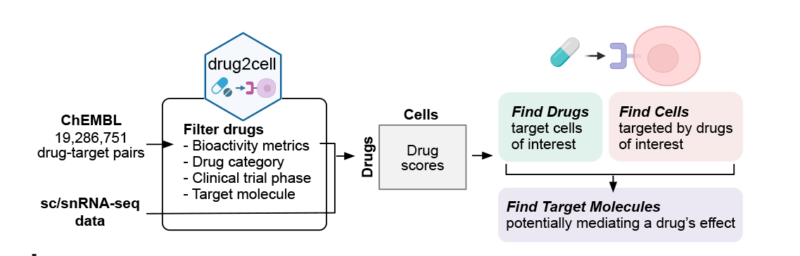 Drug2cell can identify specific cellular targets of bioactive molecules with drug properties based on single-cell RNA-seq data. This offers a new perspective on drug discovery process potentially revealing hidden mechanisms of action and predicting the impact of medicines on specific cell types.