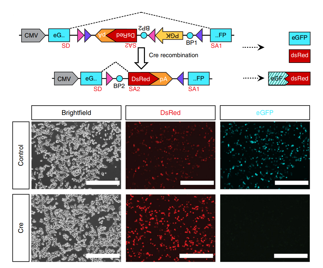 - Reversibility: the cassette is designed so that the use of a second recombinase restores gene expression.