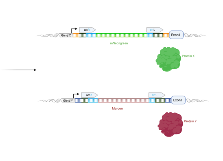 - Upon expression, the Bxb1 recombinase recognises the integrated, now double-stranded recombination cassette in the genomic locus (attP) and the universal donor plasmid (attB) and facilitates the integration of the donor at the defined locus.