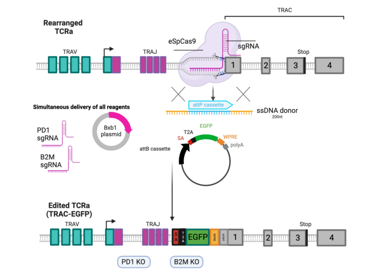 - Generation of ‘off-the-shelf’ CART cells resistant to alloresponsive T -cell attacks and with reduced exhaustion. This could be achieved by combining ONE STEP tagging at the TCR locus with targeted knock-out at the B2M and PD-1 loci.