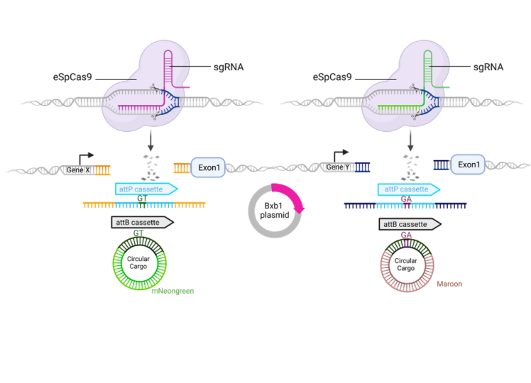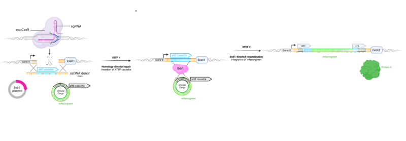 - The Cas endonuclease RNP complex generates a site-specific cut in the genome which upon repair can utilise the ssODN as HDR template, resulting in introduction of a recombinase cassette (attP) site into a specific genomic locus.
